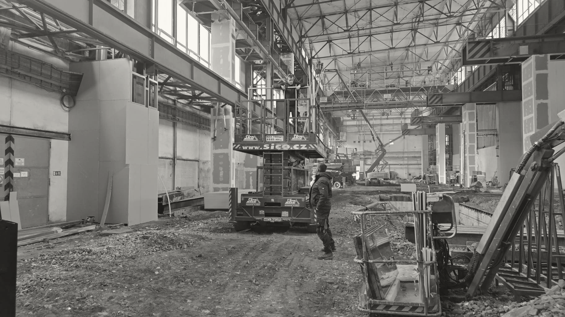 a kanceláří. Zednické páce, sádrokartony, voda, elektro, kanalizace, podlahové vytápění (2 000 m²).